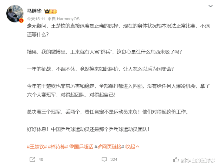 马继华老师认为王楚钦直接退赛的选择是正确的,王楚钦此前就说过‘身体已经到达极限’,这种情况根本无法正常比赛。王楚钦今年已经非常稳定,每一站都打入四强没有给任何人爆冷的机会,他已经对得起团队,对得起自己。