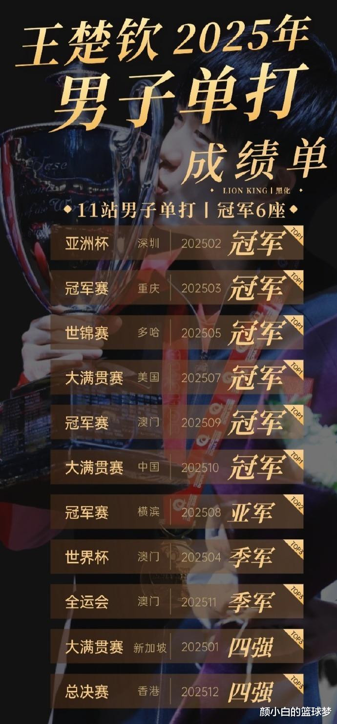 王楚钦整个2025赛季单打就出战了11站赛事,这11站他全部进入四强,而且拿到了6个冠军、1个亚军、2个季军,王楚钦真的已经非常出色。